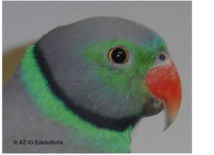 Die Weibchen haben einen grauen Kopf, Zügel und Augenbereich weisen nur einen schwachen grünlichen Anflug auf. Ober- und Unterschnabel sind Schwarz und sie besitzen nur ein breiteres schwarzes Halsband. Die mittleren Schwanzfedern sind etwas kürzer.